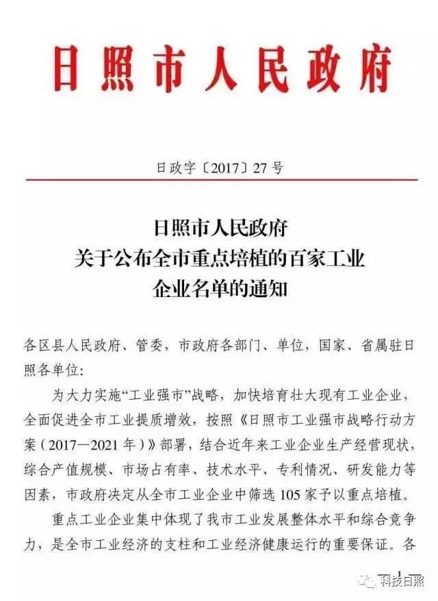 日照市政府公布的日照市重點培植的百家工業企業名單共計七大類105家,其中龍頭企業20家,骨干企業31家,成長企業20家,特色企業13家,創新企業10家,生產性服務業5家,電子信息6家。評選依據包括企業生產經營近況、綜合產值規模、市場占有率、技術水平、專利情況、研發能力等,評選目的在于促進“工業強市”戰略的實施,加快培育壯大現有工業企業,全面促進全市工業提質增效。